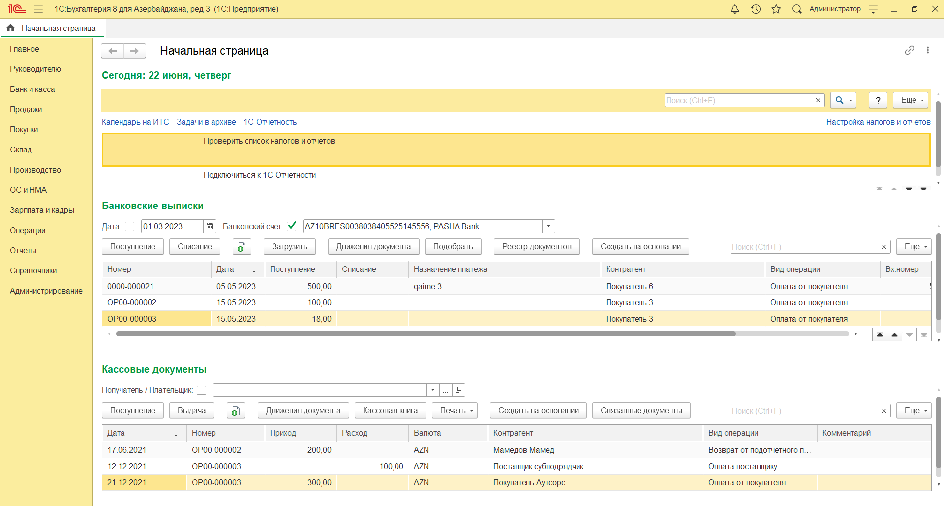 Cari hesablar yaratmağı, valyuta məzənnələrini yükləməyi, bank və kassa sənədləri ilə işləməyi